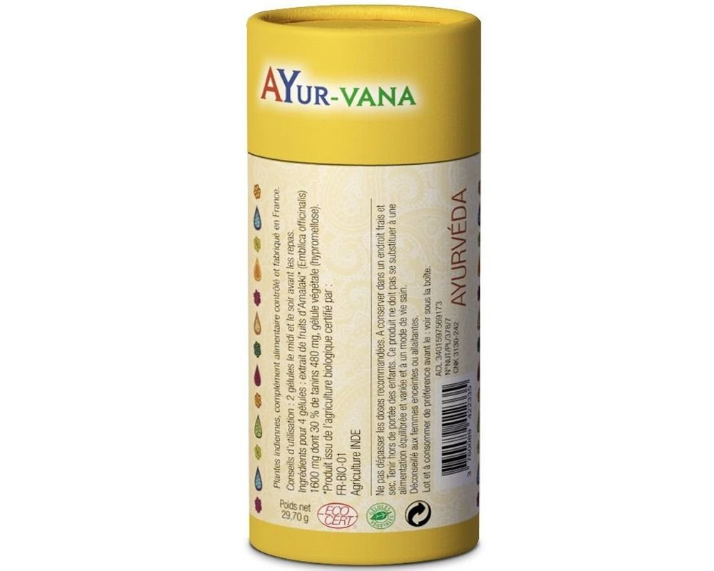 Extrait de fruits d’Amalaki (Emblica officinalis) 1600 mg dont 25% de tanins 400 mg, carbonate de magnesium 80 mg, gélule végétale