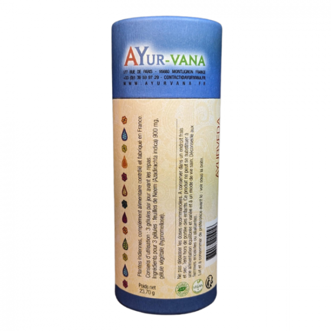Pour 3 gélules : feuilles de Neem (Azadirachta indica) 900 mg, gélule végétale (hypromellose).