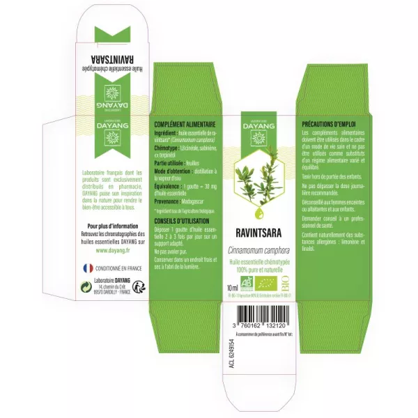 Huile essentielle de ravintsara* BIO (Cinnamomum camphora). Contient naturellement des substances allergènes : limonène et linalol.