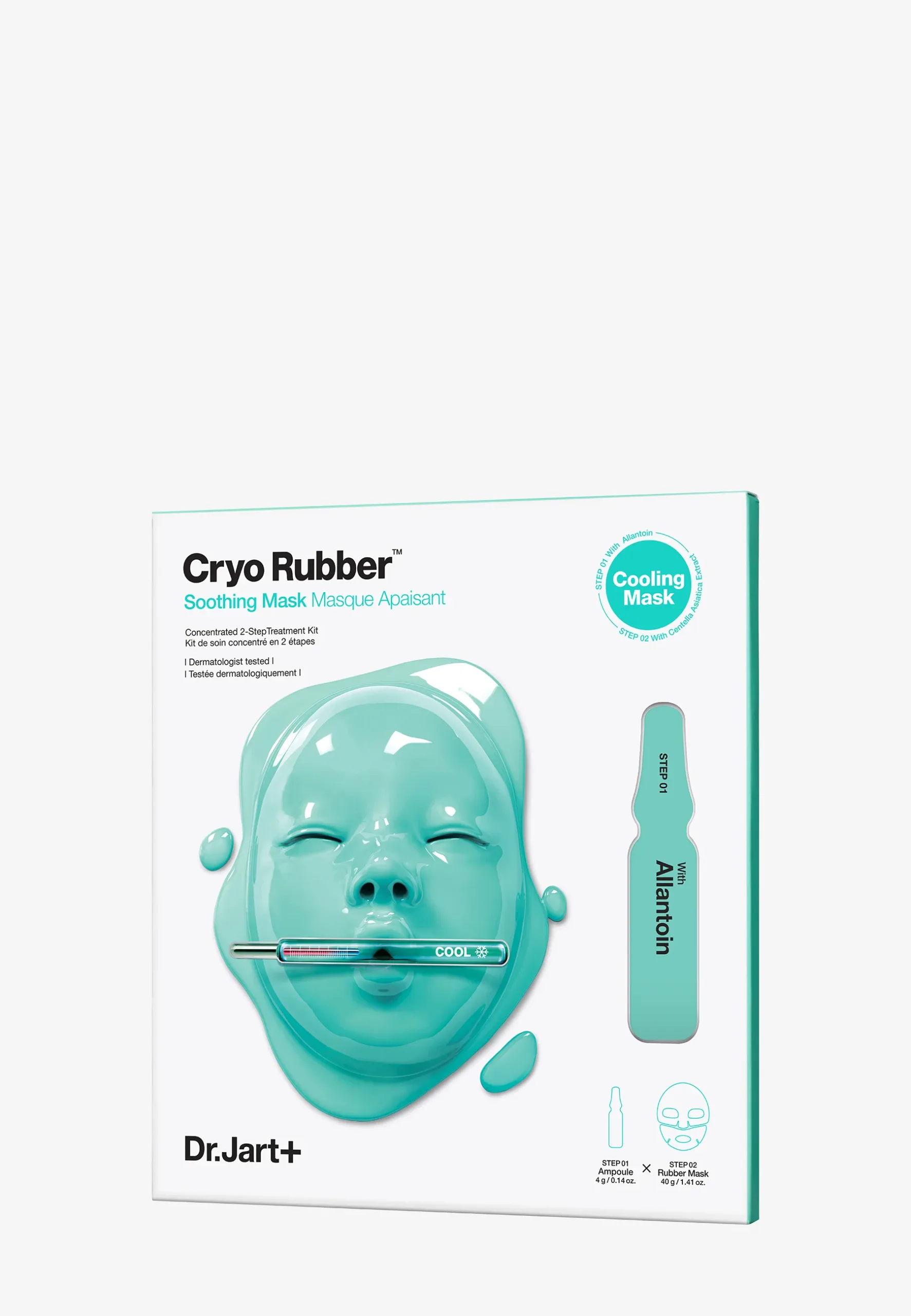 WATER\AQUA\EAU, DIPROPYLENE GLYCOL, CAPRYLIC/CAPRIC TRIGLYCERIDE, GLYCERIN, BUTYLENE GLYCOL, NIACINAMIDE, 1,2-HEXANEDIOL, PEG-240/HDI COPOLYMER BIS-DECYLTETRADECETH-20 ETHER, DIMETHICONE, GLYCERETH-26, ISOHEXADECANE, ALLANTOIN, TREHALOSE, ETHYLHEXYLGLYCERIN, BETAINE, AZADIRACHTA LEAF EXTRACT, AZADIRACHTA FLOWER EXTRACT, MANGIFERA INDICA (MANGO) SEED BUTTER, MACADAMIA TERNIFOLIA SEED OIL, ALLIUM CEPA (ONION) BULB EXTRACT, UNDARIA PINNATIFIDA EXTRACT, CYNARA SCOLYMUS (ARTICHOKE) LEAF EXTRACT, MUSA SAPIENTUM (BANANA) FRUIT EXTRACT, ASPARAGUS OFFICINALIS EXTRACT, BRASSICA OLERACEA CAPITATA (CABBAGE) LEAF EXTRACT, GLYCERYL STEARATE, PEG-100 STEARATE, HYDROXYETHYL ACRYLATE/SODIUM ACRYLOYLDIMETHYL TAURATE COPOLYMER, GLYCERYL ACRYLATE/ACRYLIC ACID COPOLYMER, POLYSORBATE 60, SORBITAN ISOSTEARATE, POTASSIUM LAURATE, CETEARYL ALCOHOL, SORBITAN SESQUIOLEATE, DISODIUM EDTA, TOCOPHEROL <ILN51121> STEP 02 Dr.Jart+ Cryo Rubber Soothing Mask WATER\AQUA\EAU, METHYLPROPANEDIOL, CHONDRUS CRISPUS EXTRACT, GLYCERIN, CERATONIA SILIQUA (CAROB) GUM, CAPRYLYL GLYCOL, AZADIRACHTA LEAF EXTRACT, ALLANTOIN, AZADIRACHTA FLOWER EXTRACT, DIPOTASSIUM GLYCYRRHIZATE, COCCINIA INDICA FRUIT EXTRACT, ETHYLHEXYLGLYCERIN, ALOE BARBADENSIS FLOWER EXTRACT, SOLANUM MELONGENA (EGGPLANT) FRUIT EXTRACT, OCIMUM SANCTUM LEAF EXTRACT, CURCUMA LONGA (TURMERIC) ROOT EXTRACT, CORALLINA OFFICINALIS EXTRACT, XYLITOL, CENTELLA ASIATICA (HYDROCOTYL) EXTRACT, GLUCOSE, XANTHAN GUM, POTASSIUM CHLORIDE, DIPROPYLENE GLYCOL, ALGIN, SUCROSE, PANTHENOL, CALCIUM CHLORIDE, POLYGLYCERYL-10 LAURATE, CITRIC ACID, XYLITYLGLUCOSIDE, 1,2-HEXANEDIOL, ANHYDROXYLITOL, HYDROGEN DIMETHICONE, KAOLIN, DIATOMACEOUS EARTH\SOLUM DIATOMEAE\TERRE DE DIATOMÉES, DISODIUM EDTA, SODIUM CITRATE, HYDROXYACETOPHENONE, TITANIUM DIOXIDE