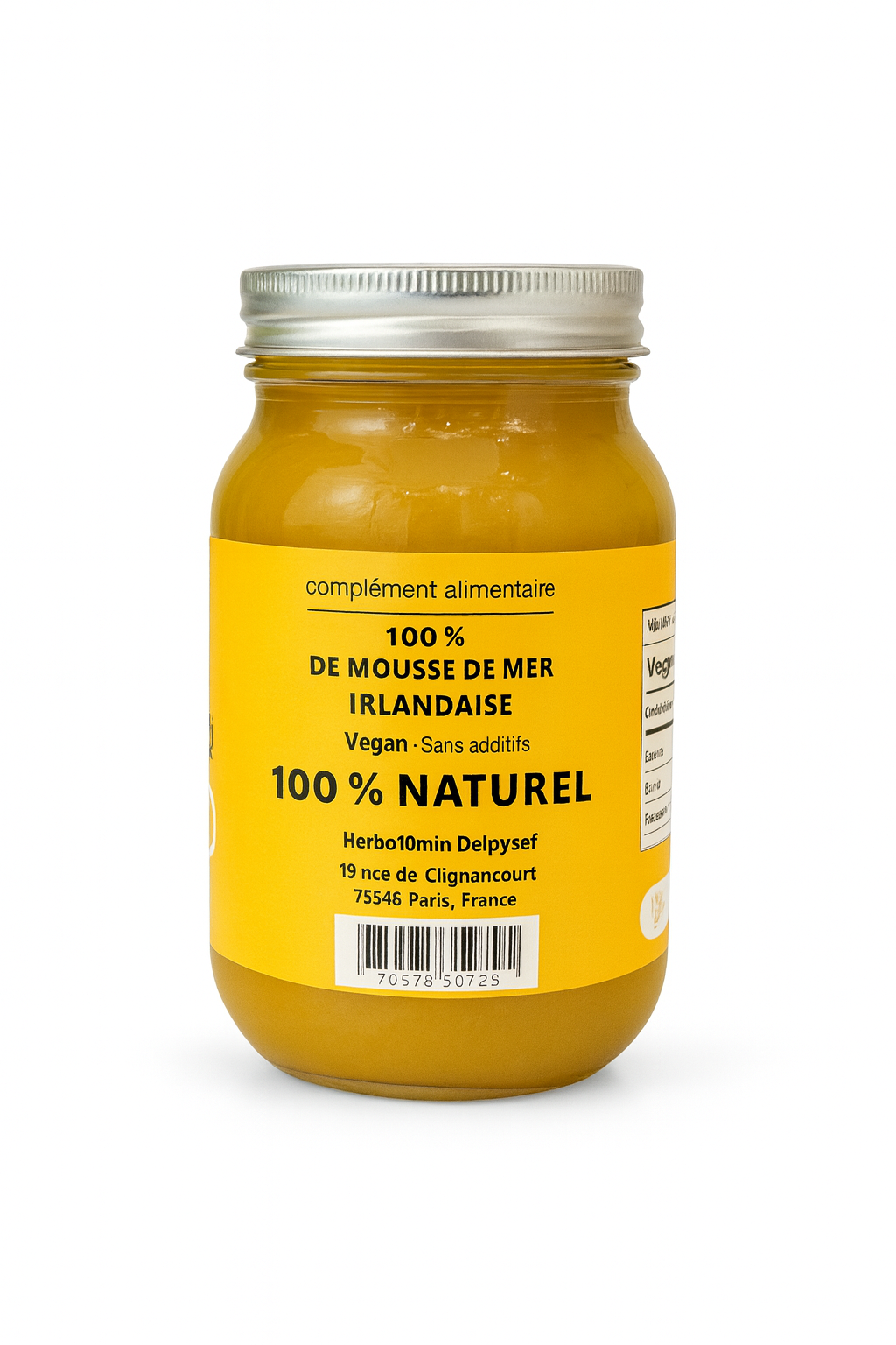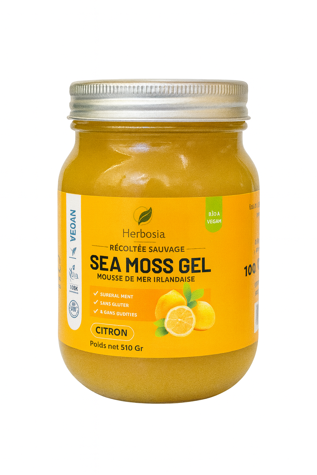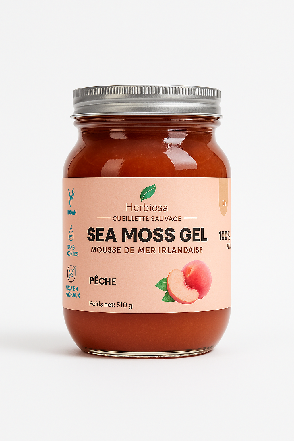 Sea Moss (Chondrus crispus) issue de cueillette durable – eau purifiée – jus de fruits ou arômes naturels citron & pêche – jus de citron (conservateur naturel).