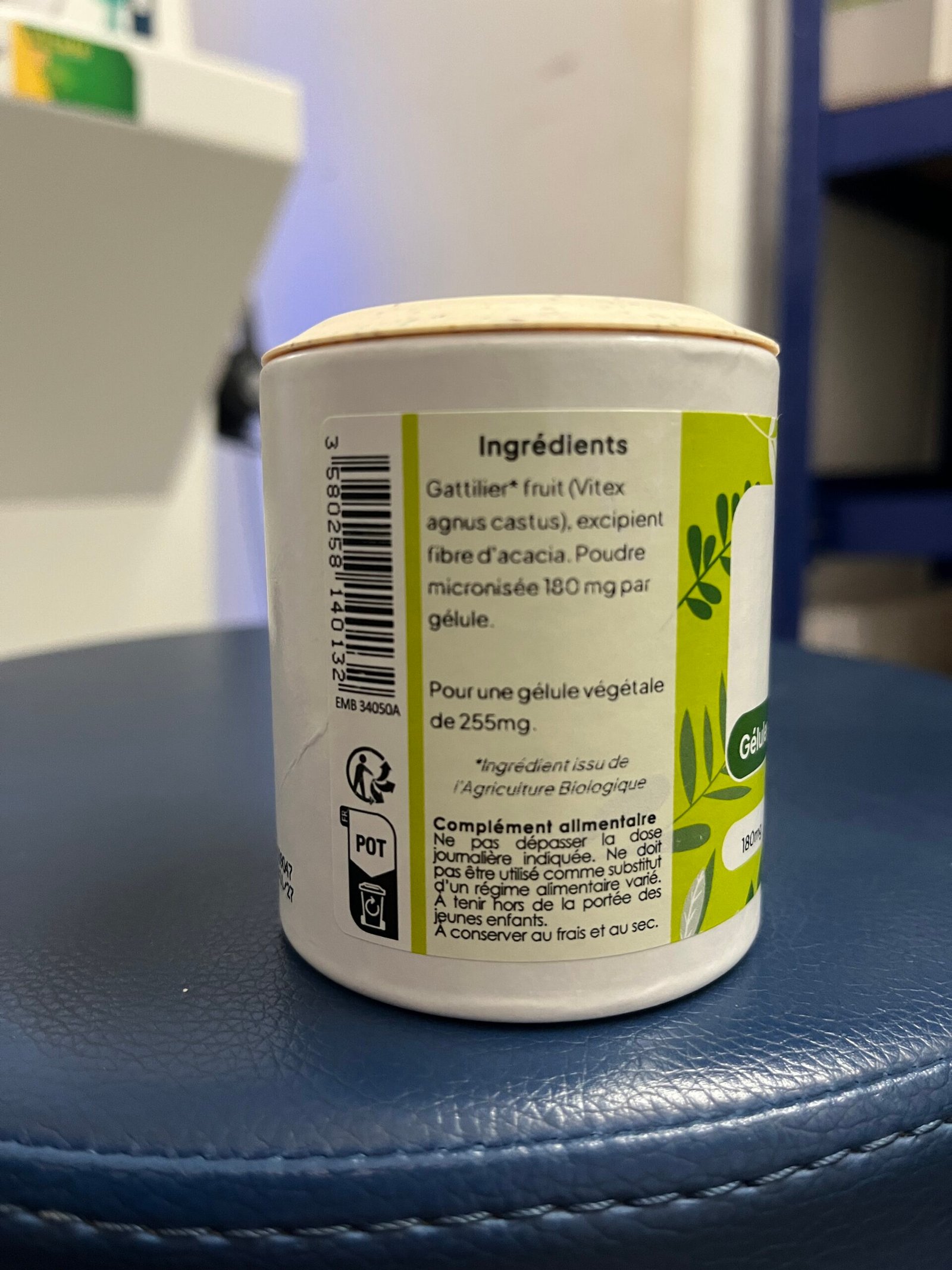 Apport journaliers (pour 6 gélules) : 96 mg de Gattilier, 84 mg de fibre d’Acacia.