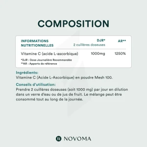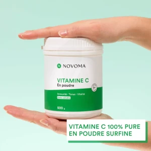 Novoma Vitamine C 100% Poudre 500 g, une formule pure pour renforcer l’immunité, réduire la fatigue et protéger les cellules.