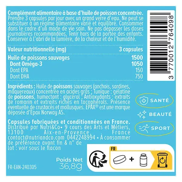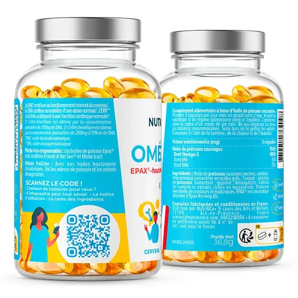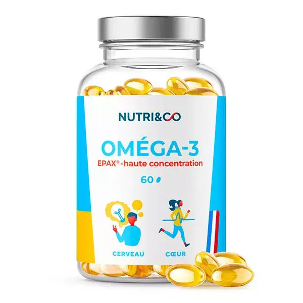 Le Nutri&Co Omega-3 60 gélules est un complément riche en EPA et DHA, issus d’huiles de poissons sauvages, conçu pour soutenir la santé cardiovasculaire, cognitive et articulaire.