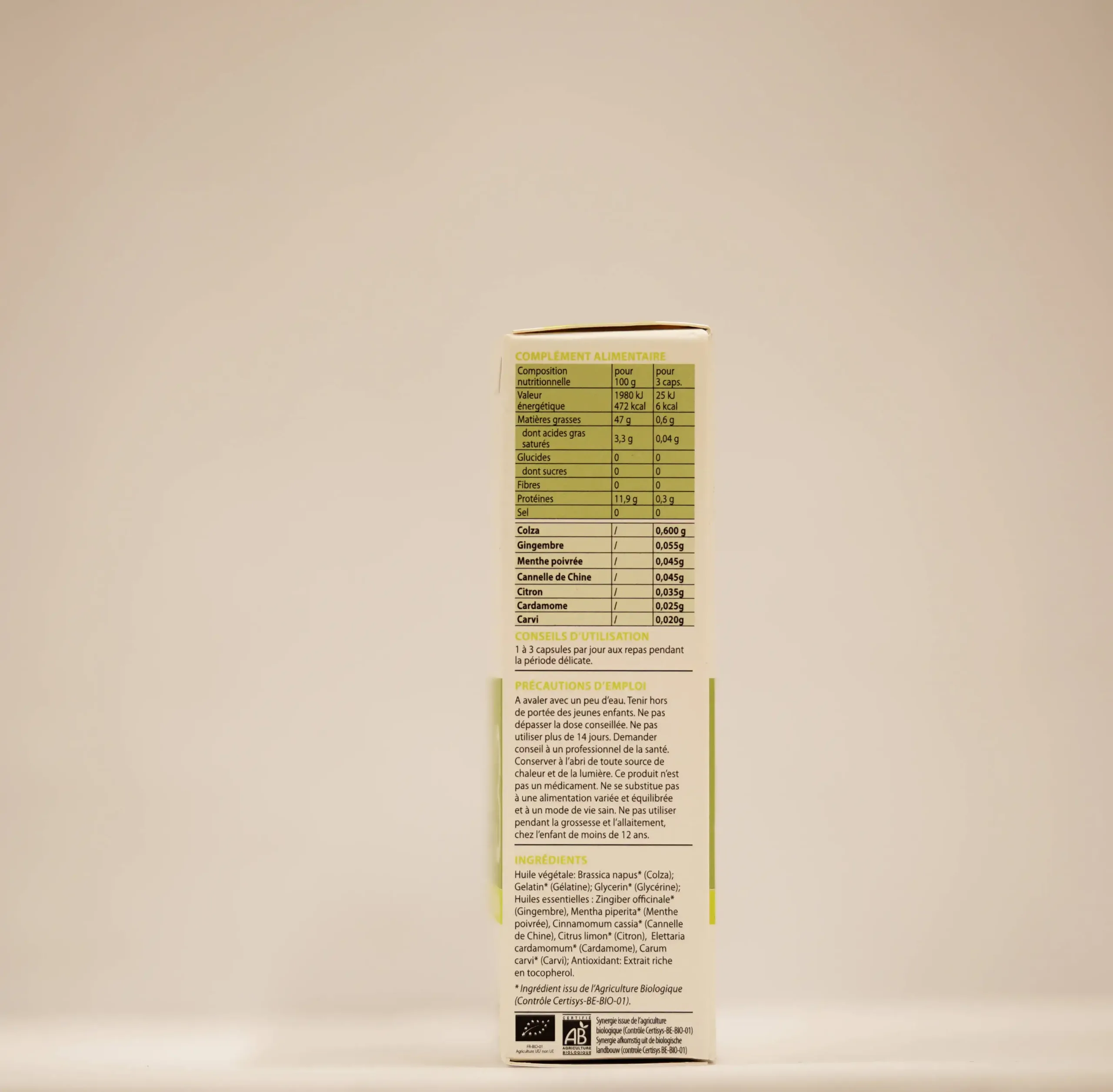 Huile végétale: Brassica napus* (Colza); Gelatin* (Gélatine); Glycerin* (Glycérine); Huiles essentielles : Zingiber o cinale* (Gingembre), Mentha piperita* (Menthe poivrée), Cinnamomum cassia* (Cannelle de Chine), Citrus limon* (Citron), Elettaria cardamomum* (Cardamome), Carum carvi* (Carvi); Antioxidant: Extrait riche en tocopherol.