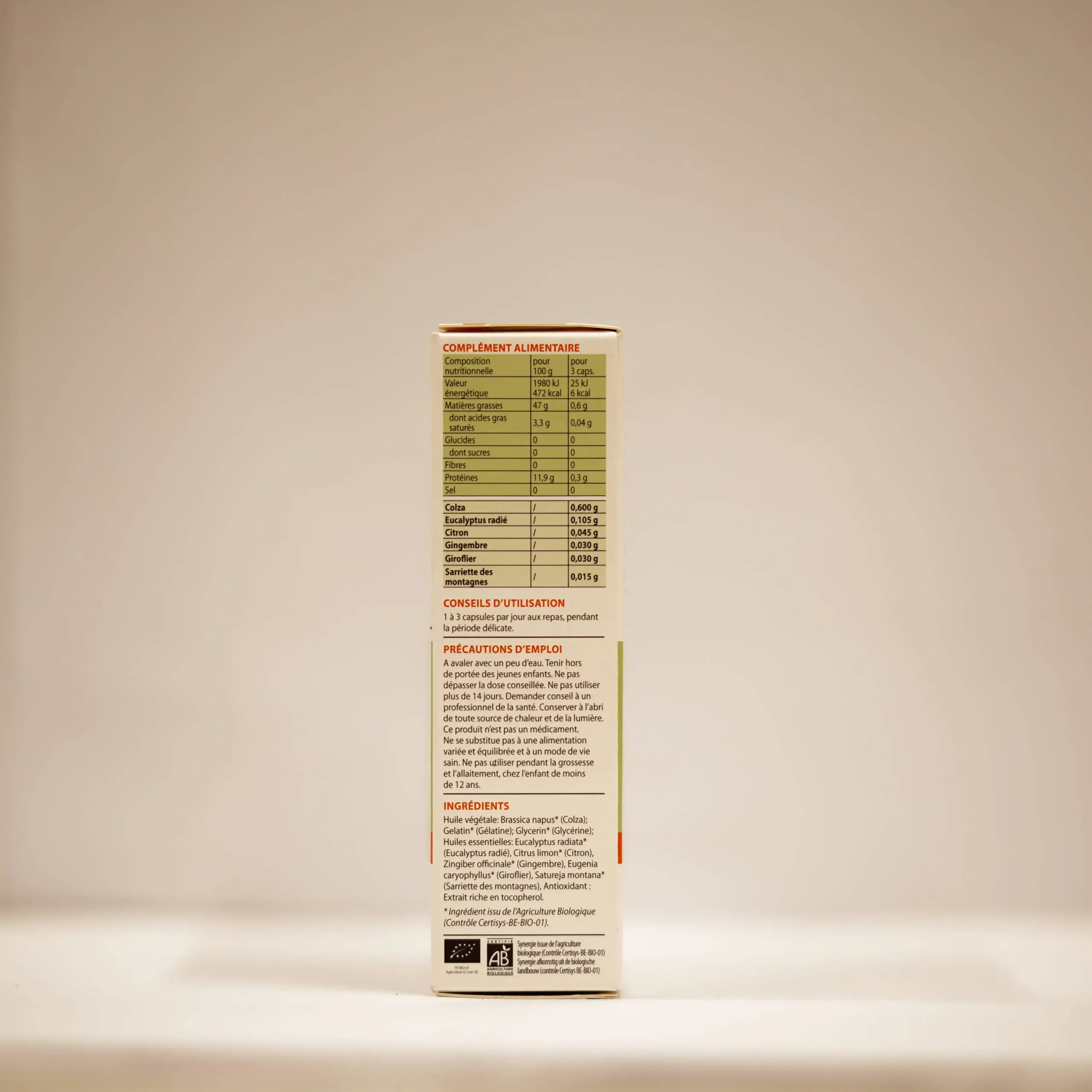 Huile végétale : Brassica napus* (Colza) ; Gelatin* (Gélatine) ; Glycerin* (Glycérine) ; Huiles essentielles : Eucalyptus radiata* (Eucalyptus radié), Citrus limon* (Citron), Zingiber officinale* (Gingembre), Eugenia caryophyllus* (Giroier), Satureja montana* (Sarriette des montagnes), Antioxydant : extrait riche en tocophérol.