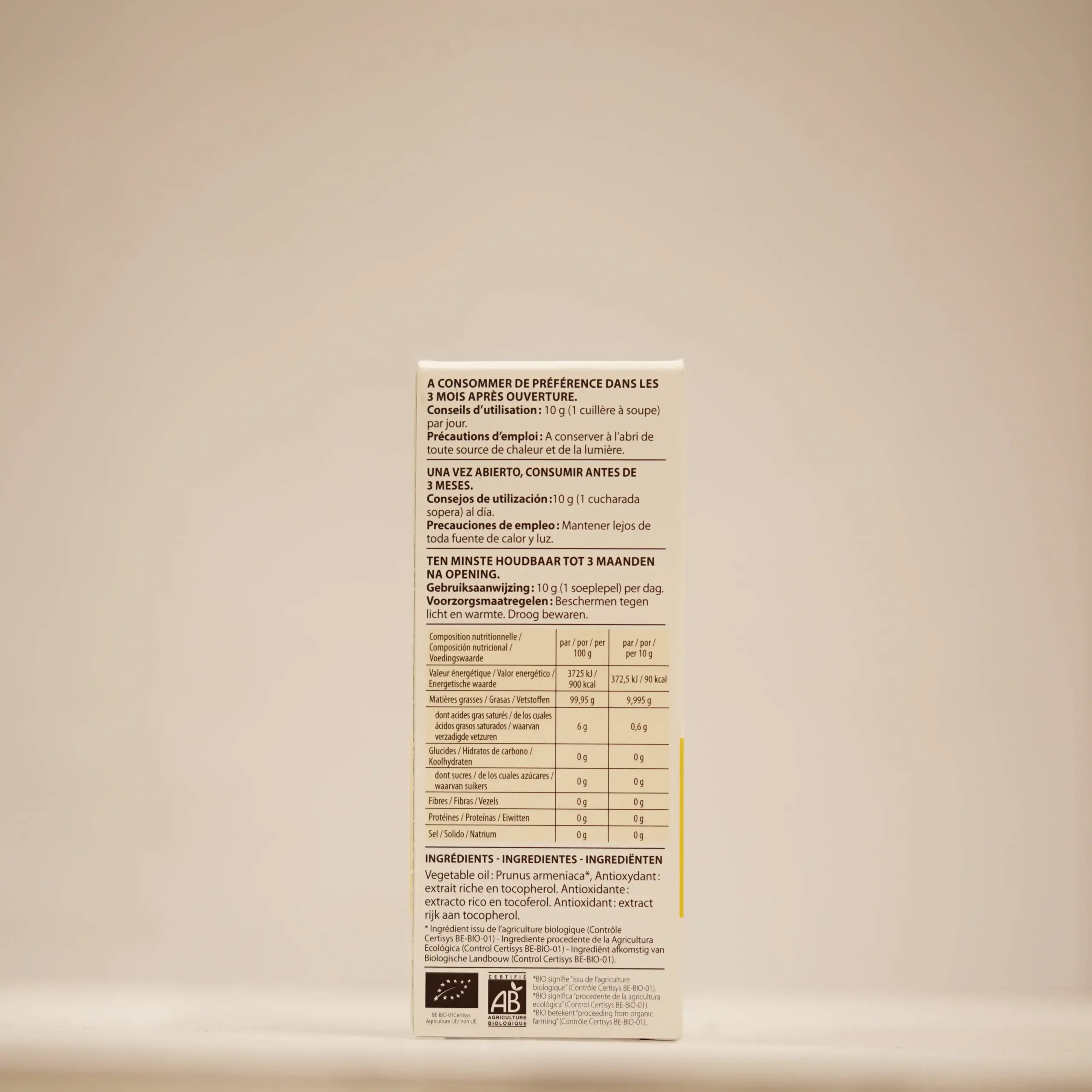 Vegetable oil : Prunus armeniaca*, Antioxydant : extrait riche en tocopherol.