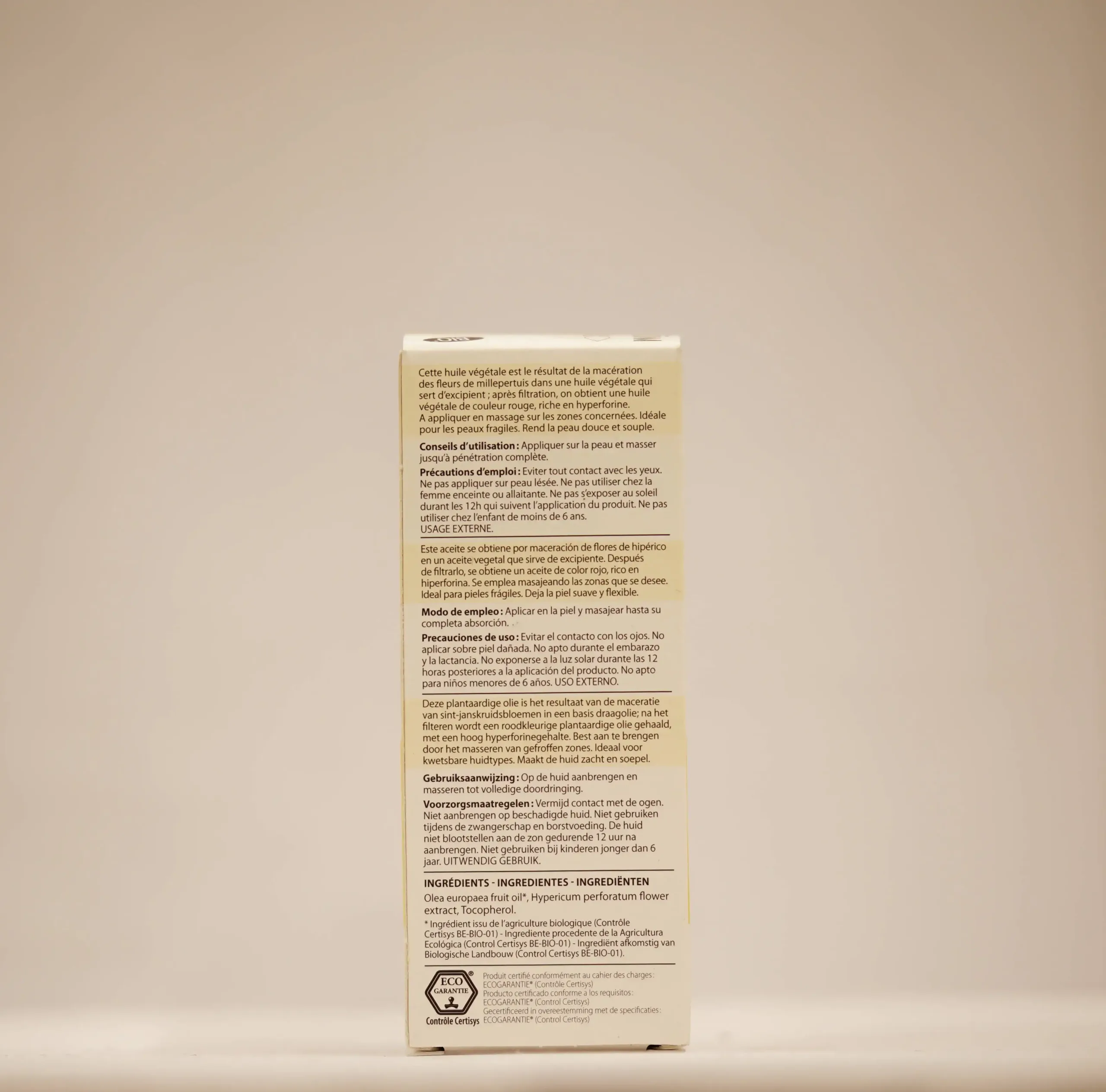 Des acides gras complexes, en fonction de l’huile utilisée pour la macération. Des traces d’huile essentielle de millepertuis, réputée anti-inflammatoire et décongestionnante. Des phytostérols anti-inflammatoires et cicatrisants : hyperforine et hypericine (photosensibilisants).