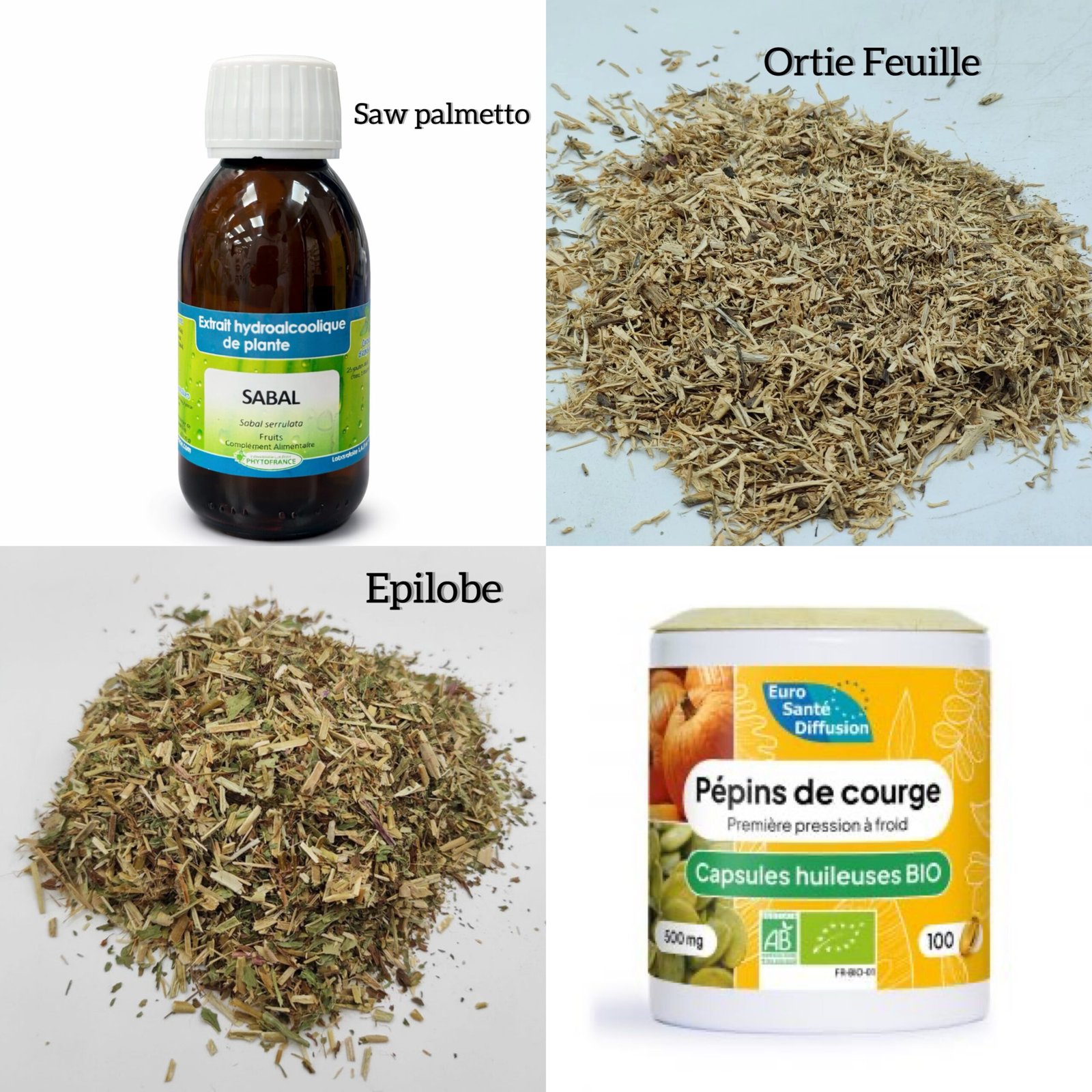 Ce protocole est élaboré par Herboristerie Dufayel et composé de 4 plantes ( Epilobe 250g, Ortie feuille 250g, Huile de pépins de courge 250 capsules, Saw Palmetto–Teinture mère 125ml)