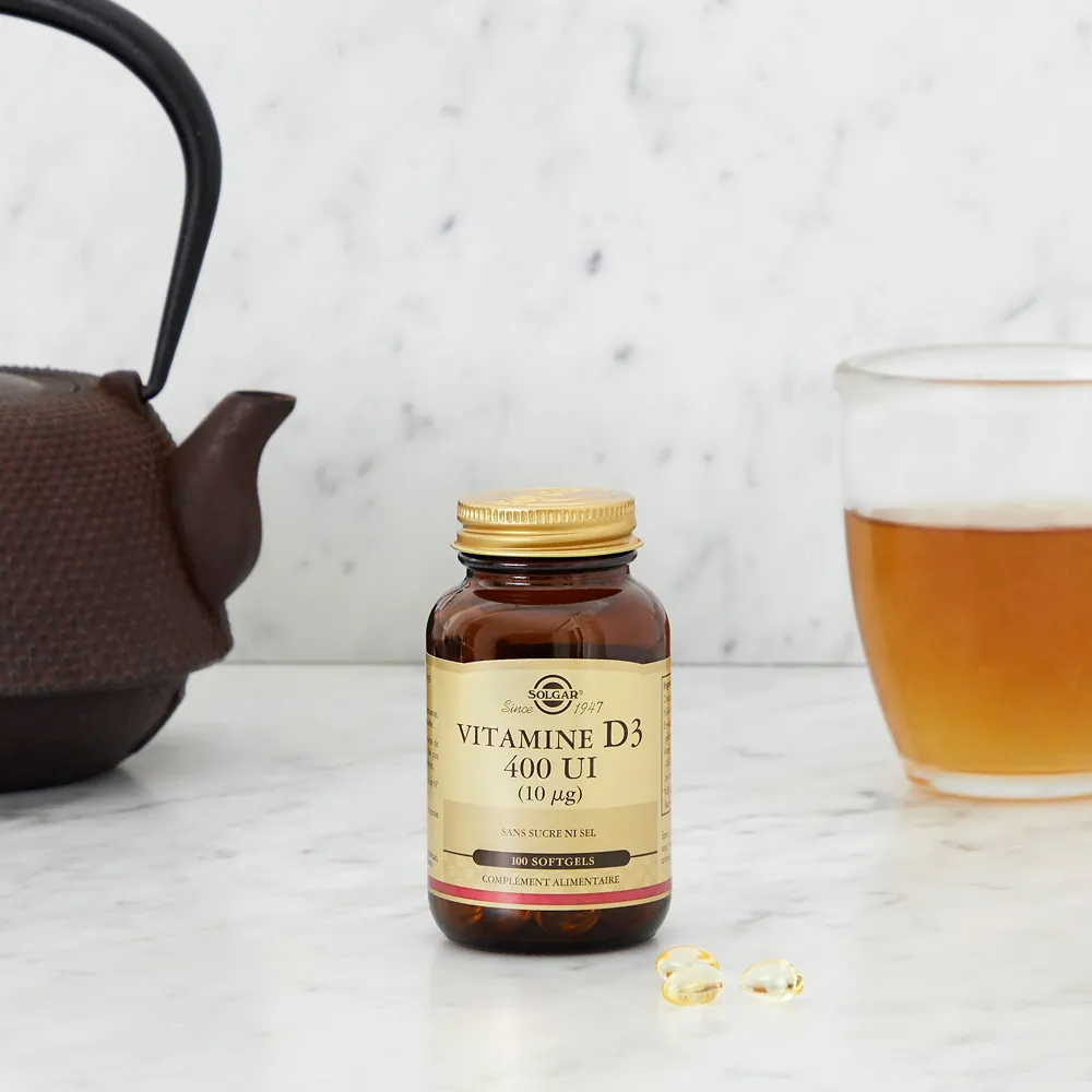 Solgar Vitamine D3 400 UI Softgels, des capsules faciles à prendre pour soutenir la santé des os et renforcer le système immunitaire.