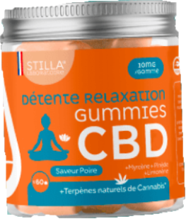 Poire : Sirop de glucose, Sucre de betterave, eau, agent gélifiant : pectine , cannabidiol, terpènes, aromes, colorant naturel, agent acidifiant : acide malique, agent enrobage : sucre